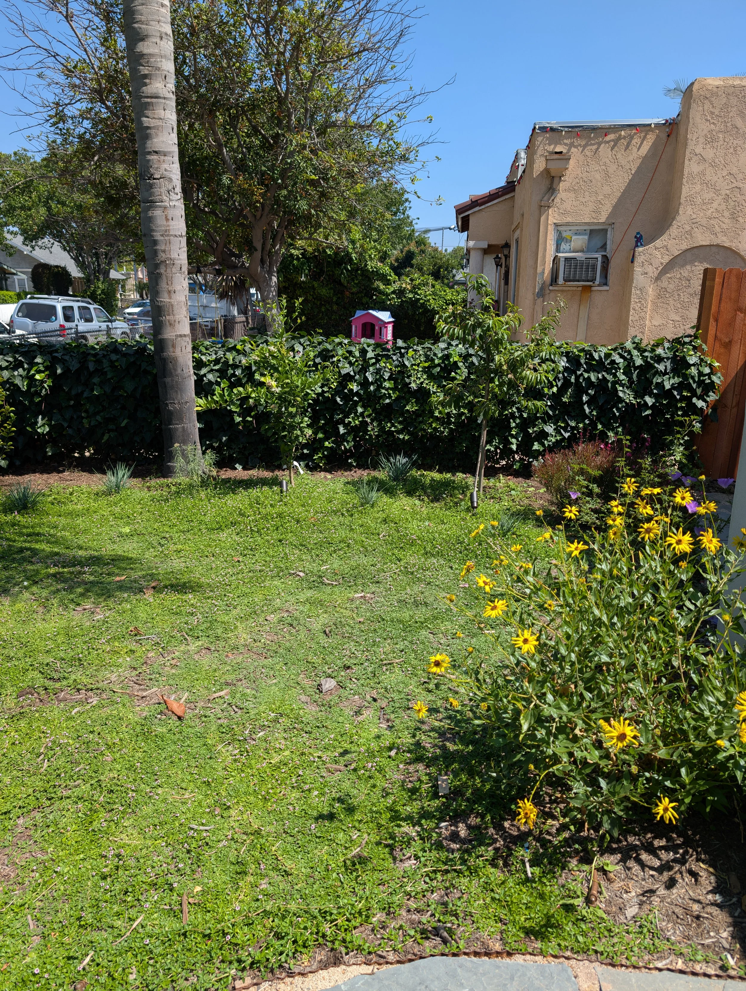 Water-harvesting edible and native California front yard. traditional lawn replaced with low water Kurapia lawn.
