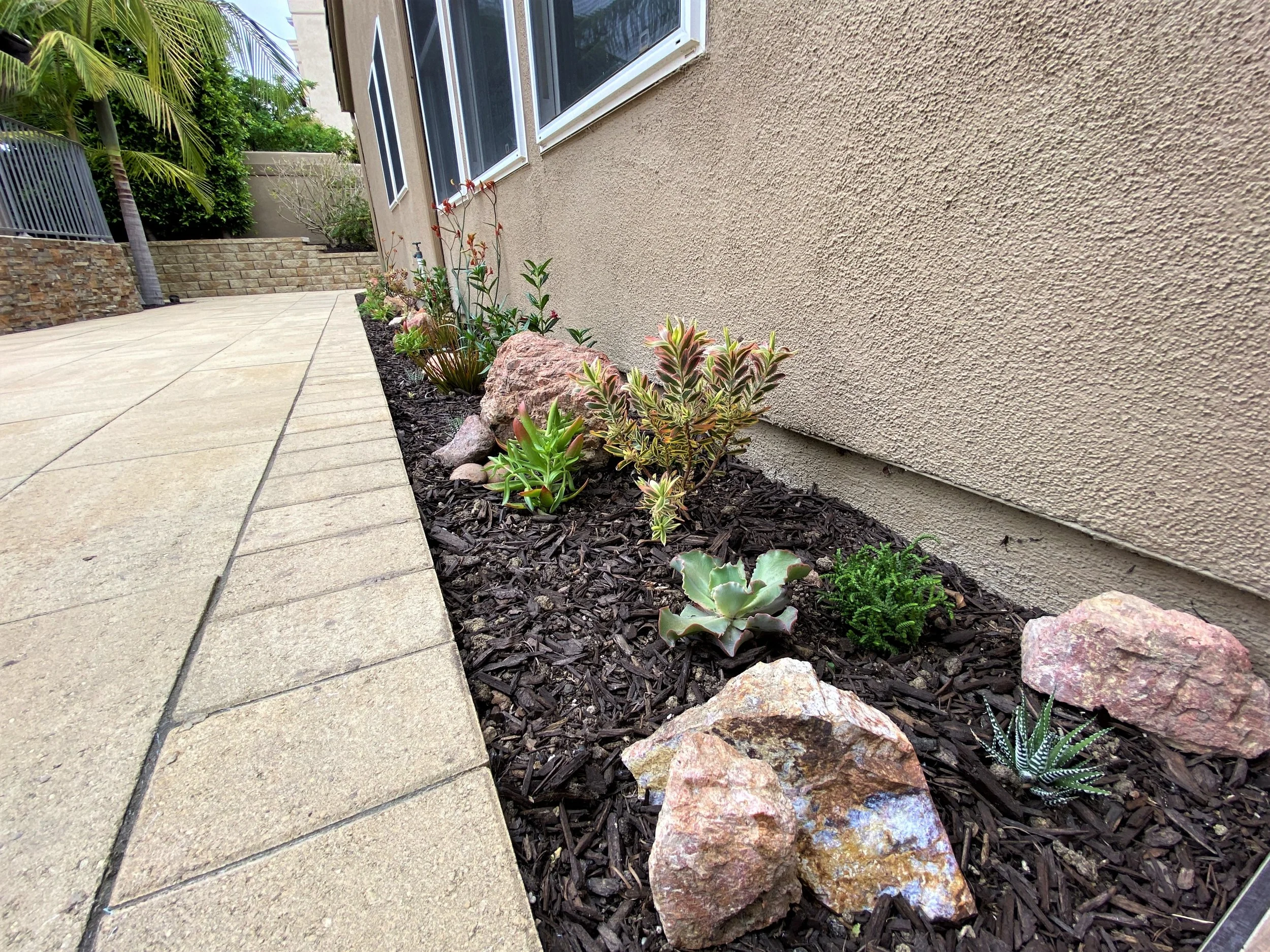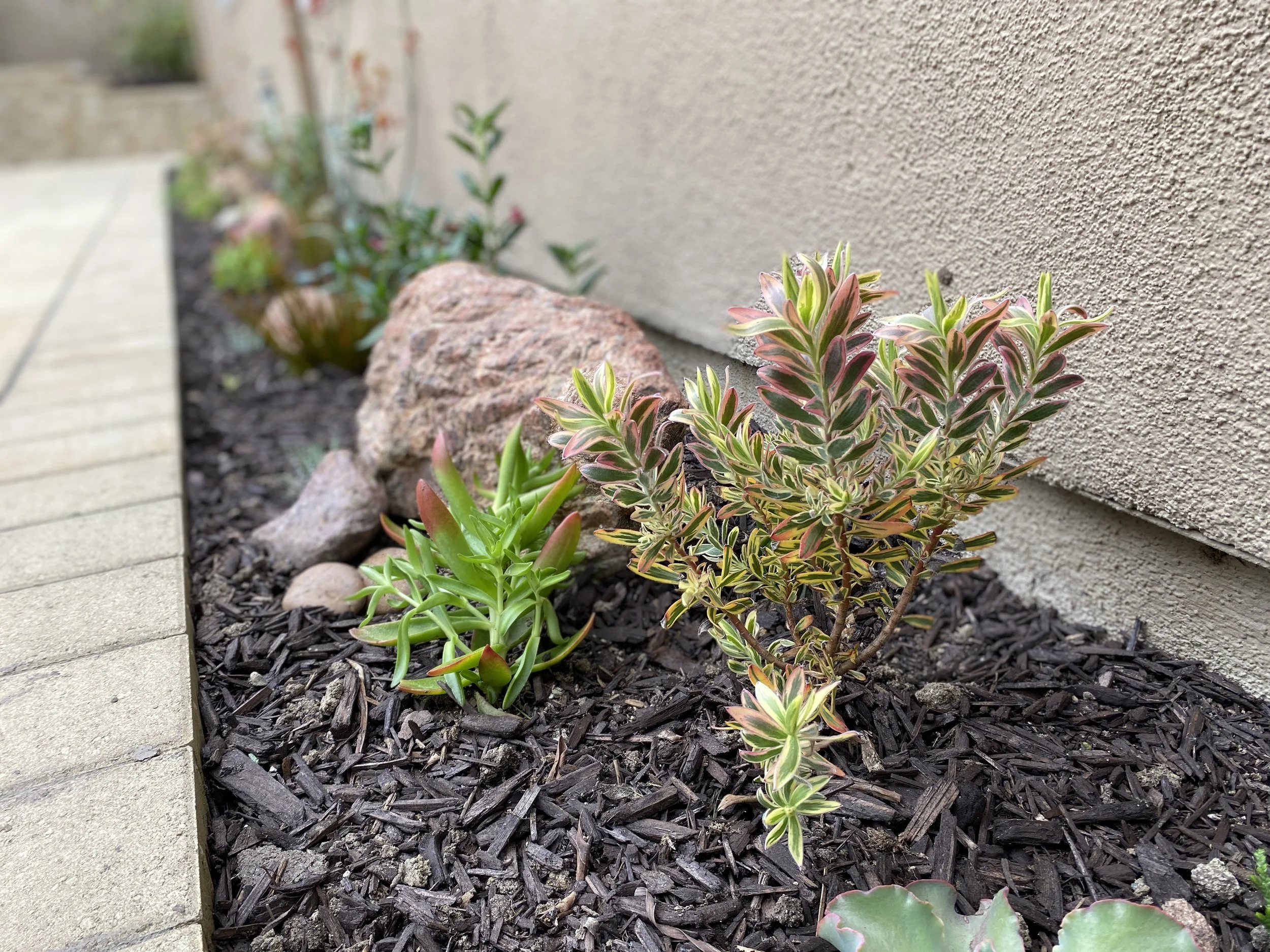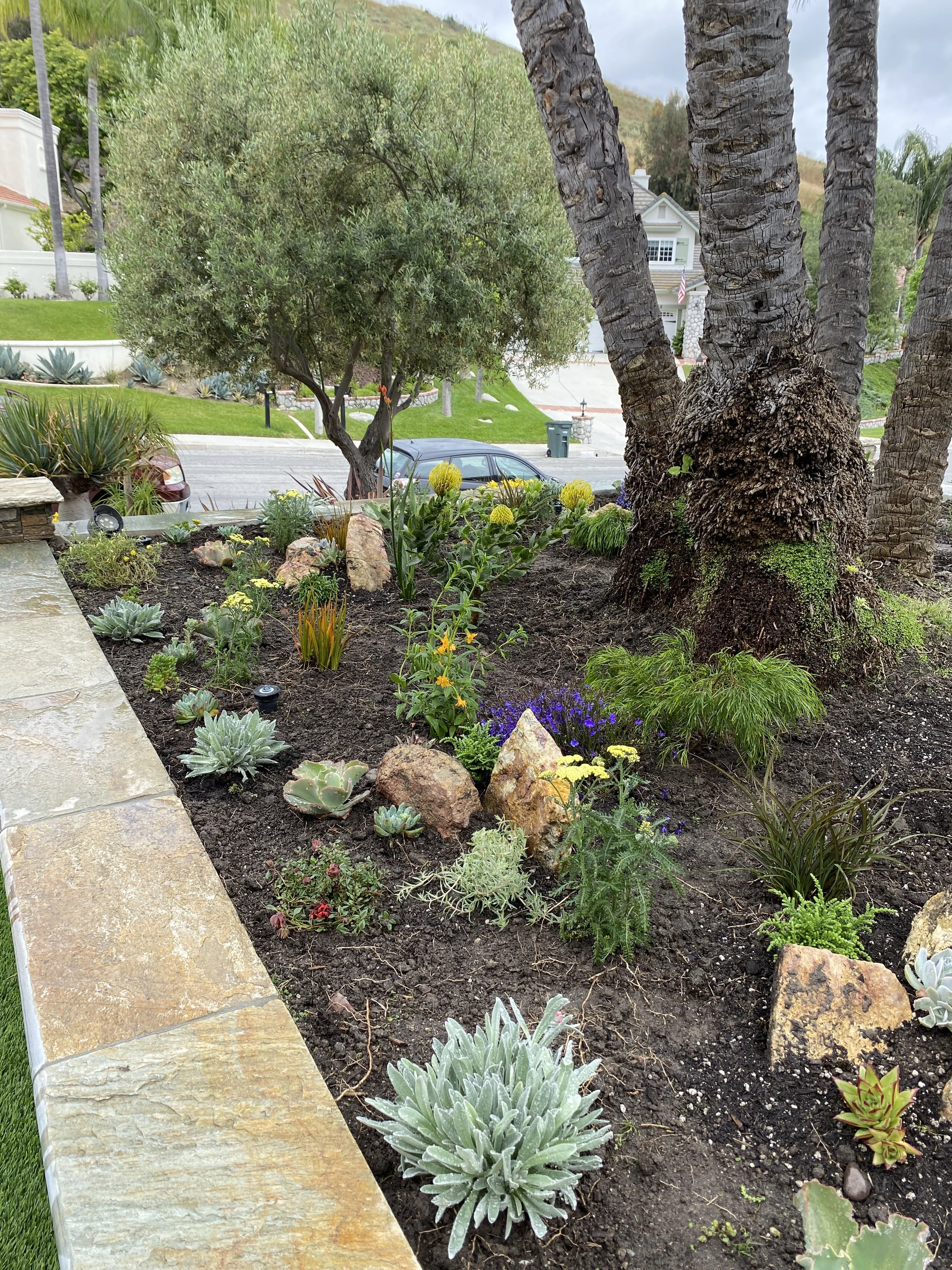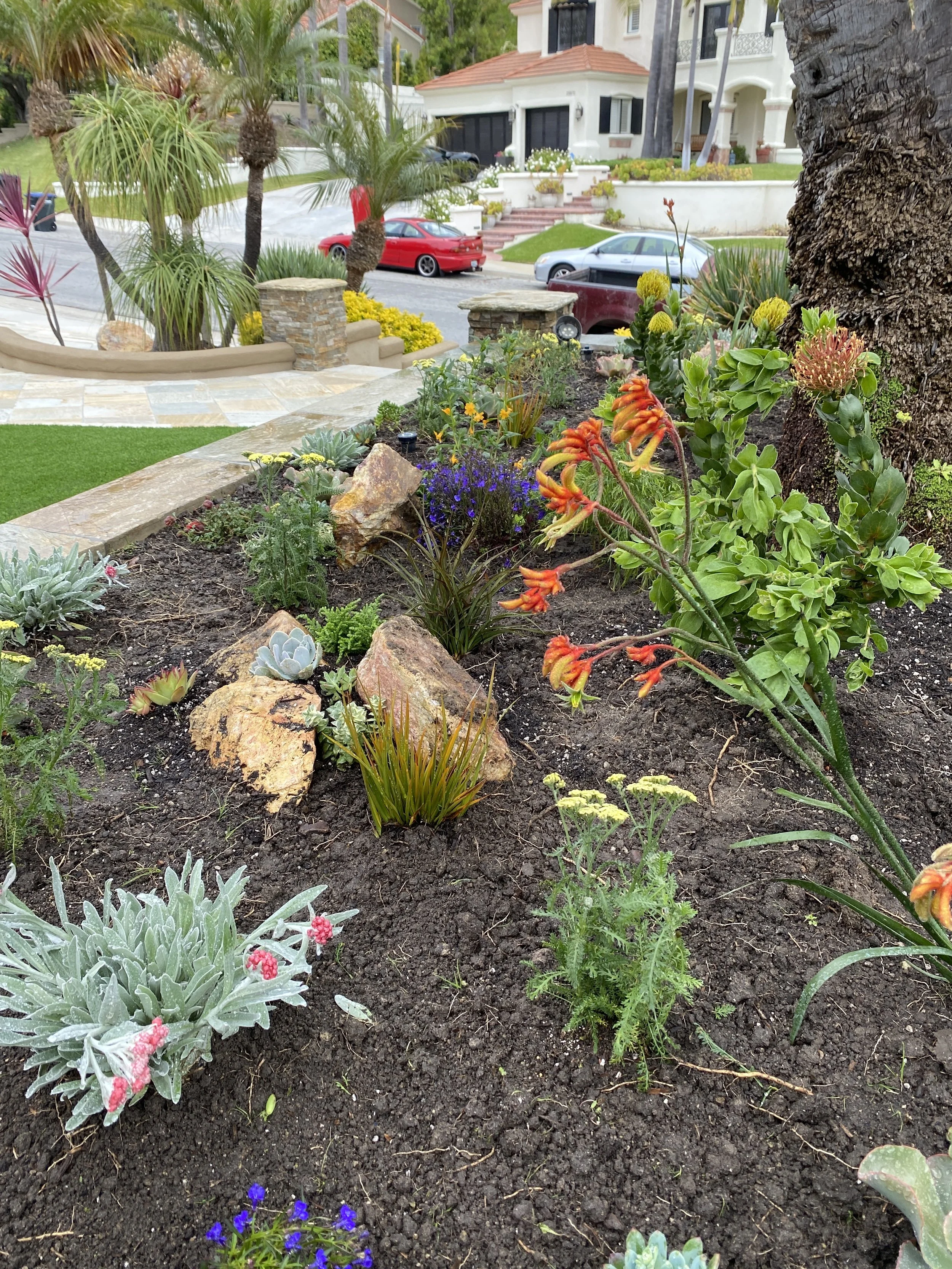 With a color pallette of yellows, reds, and oranges a large palm planter and two tiny planting strips in the back are now little vignettes of colors and textures that take you on a journey. These spaces were previously used for rotating flowers, now they will save a lot of water and have a full lush garden that’s easy to care for.