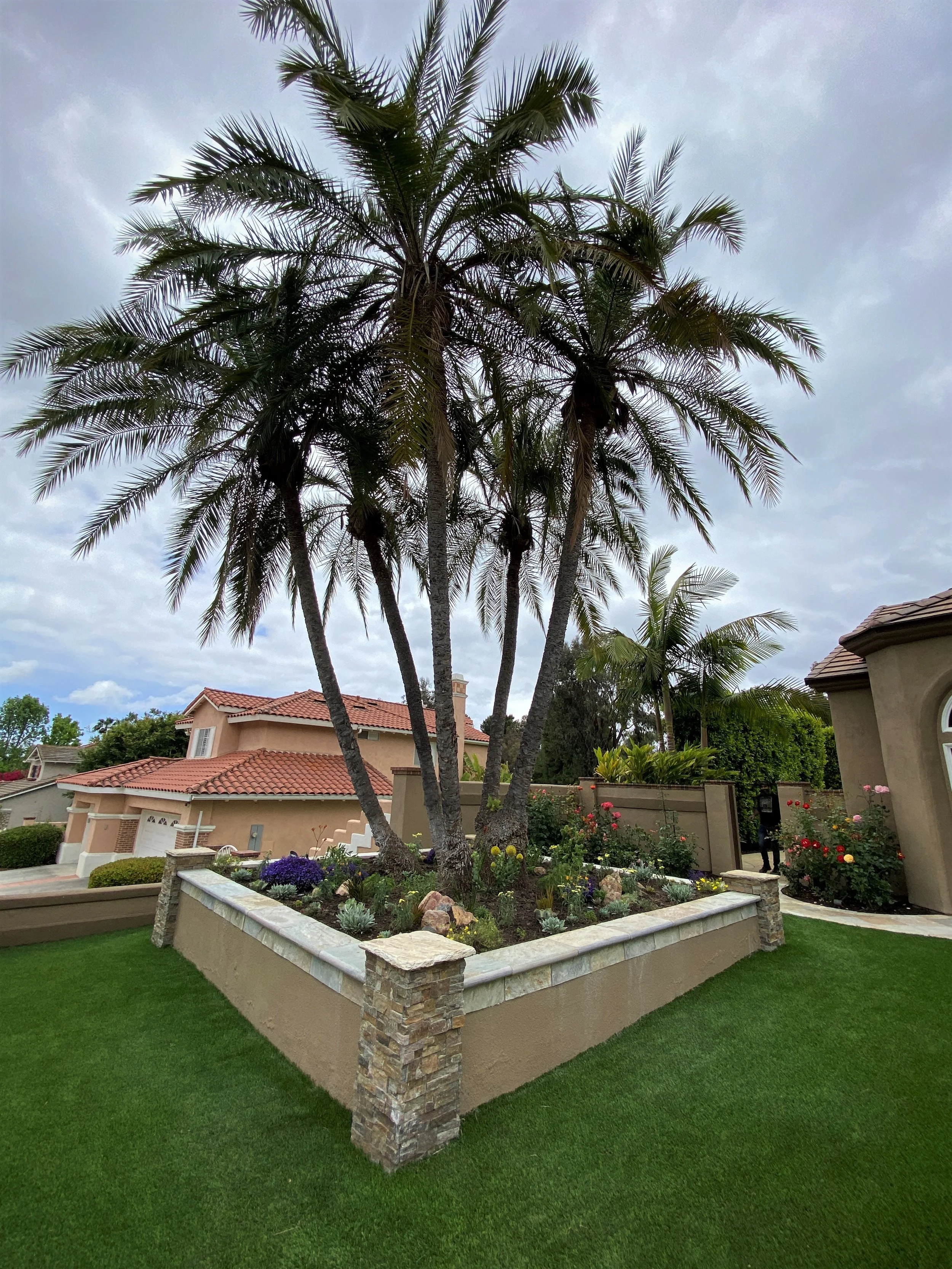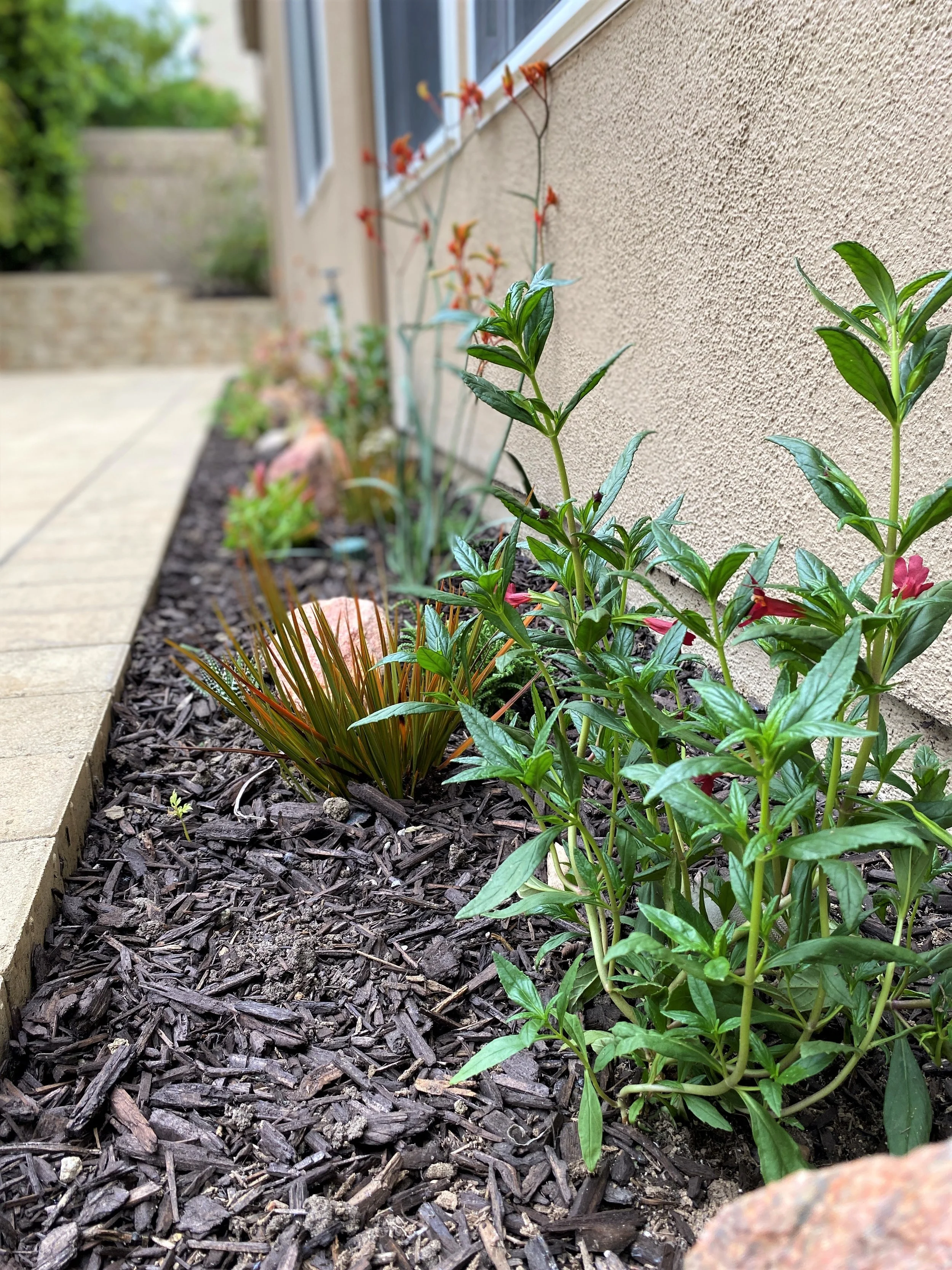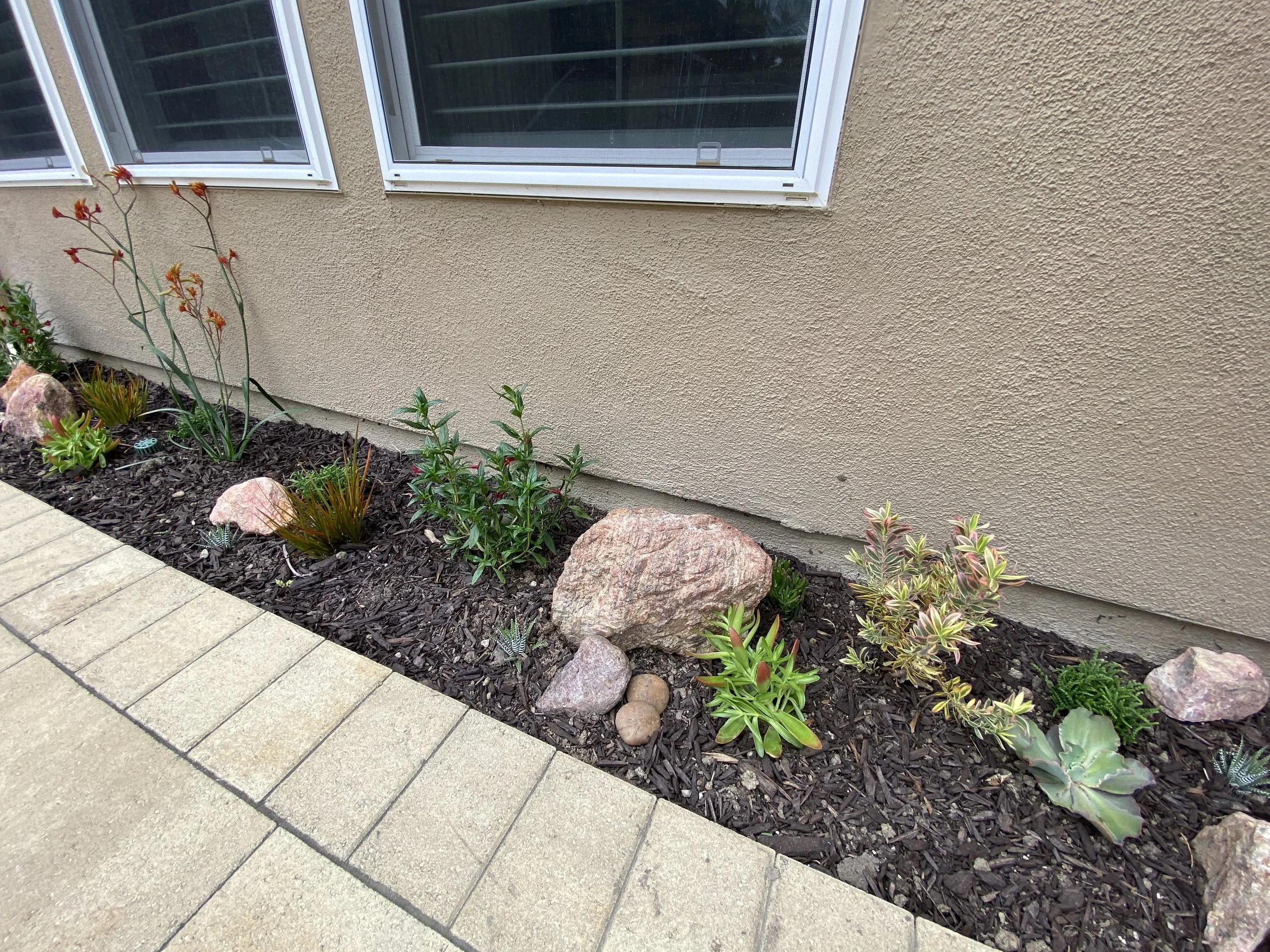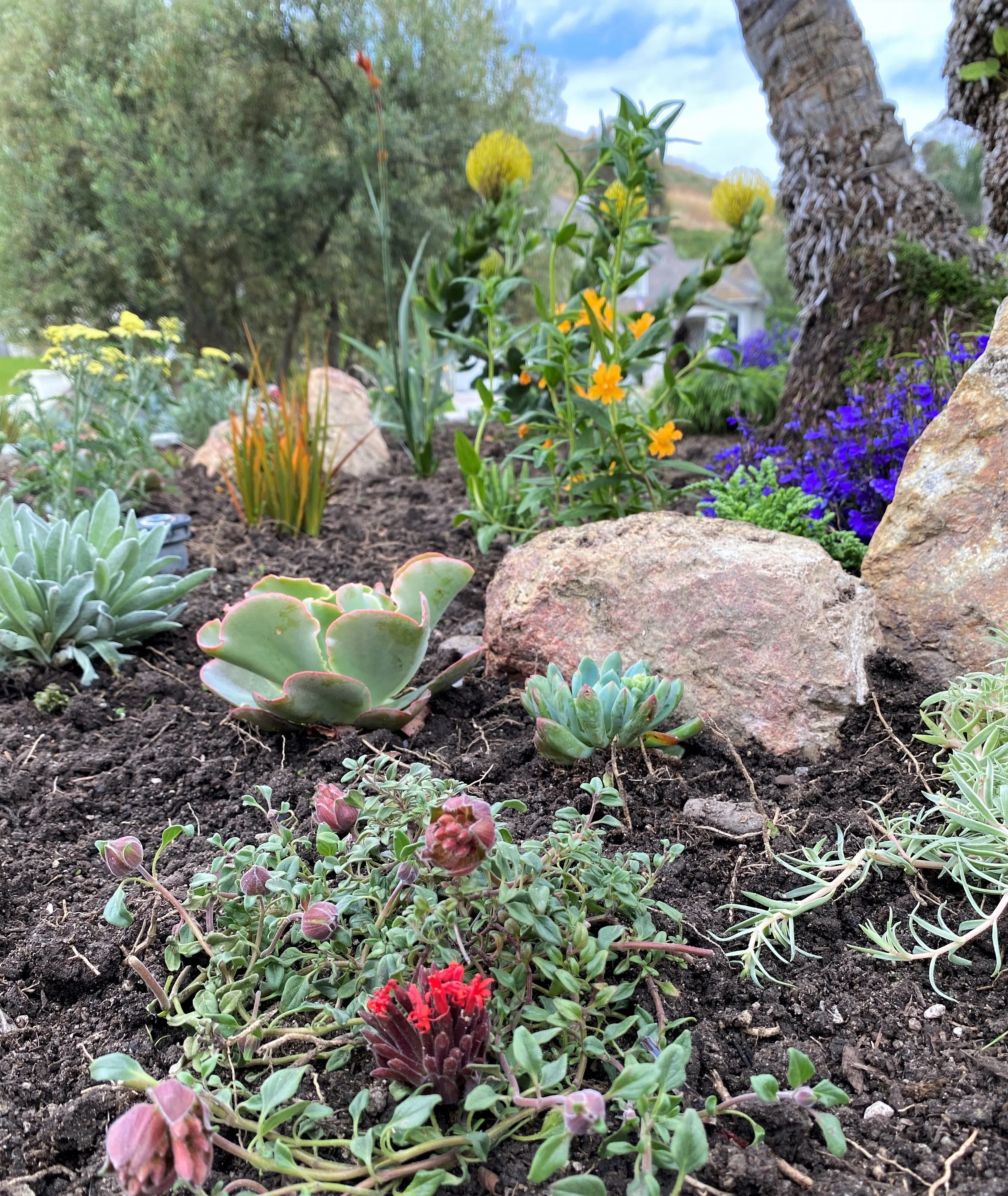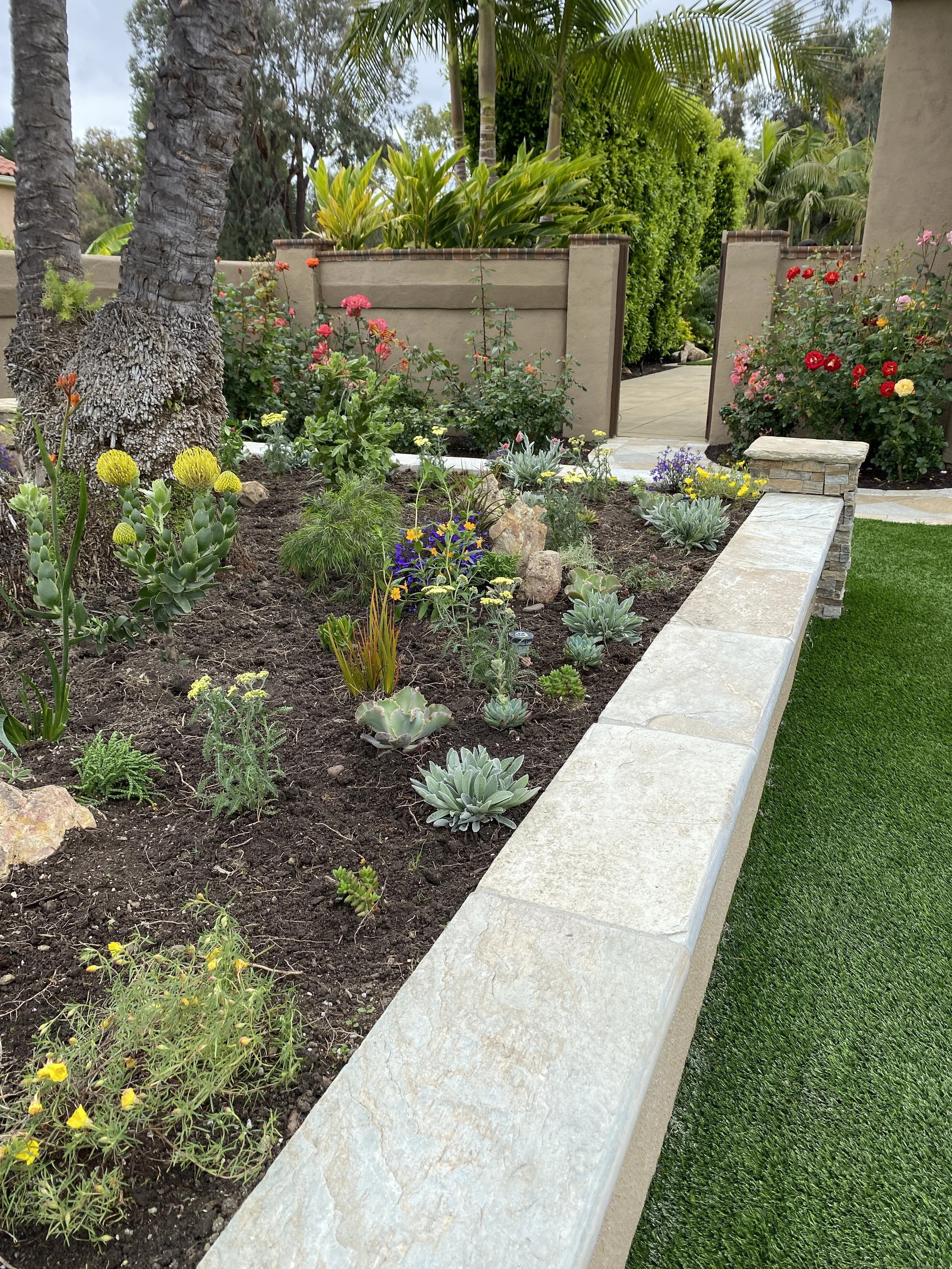 With a color pallette of yellows, reds, and oranges a large palm planter and two tiny planting strips in the back are now little vignettes of colors and textures that take you on a journey. These spaces were previously used for rotating flowers, now they will save a lot of water and have a full lush garden that’s easy to care for.