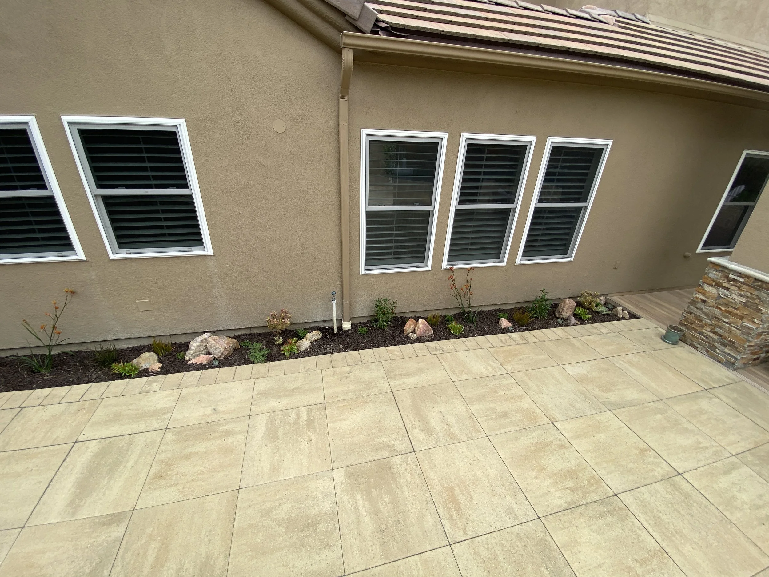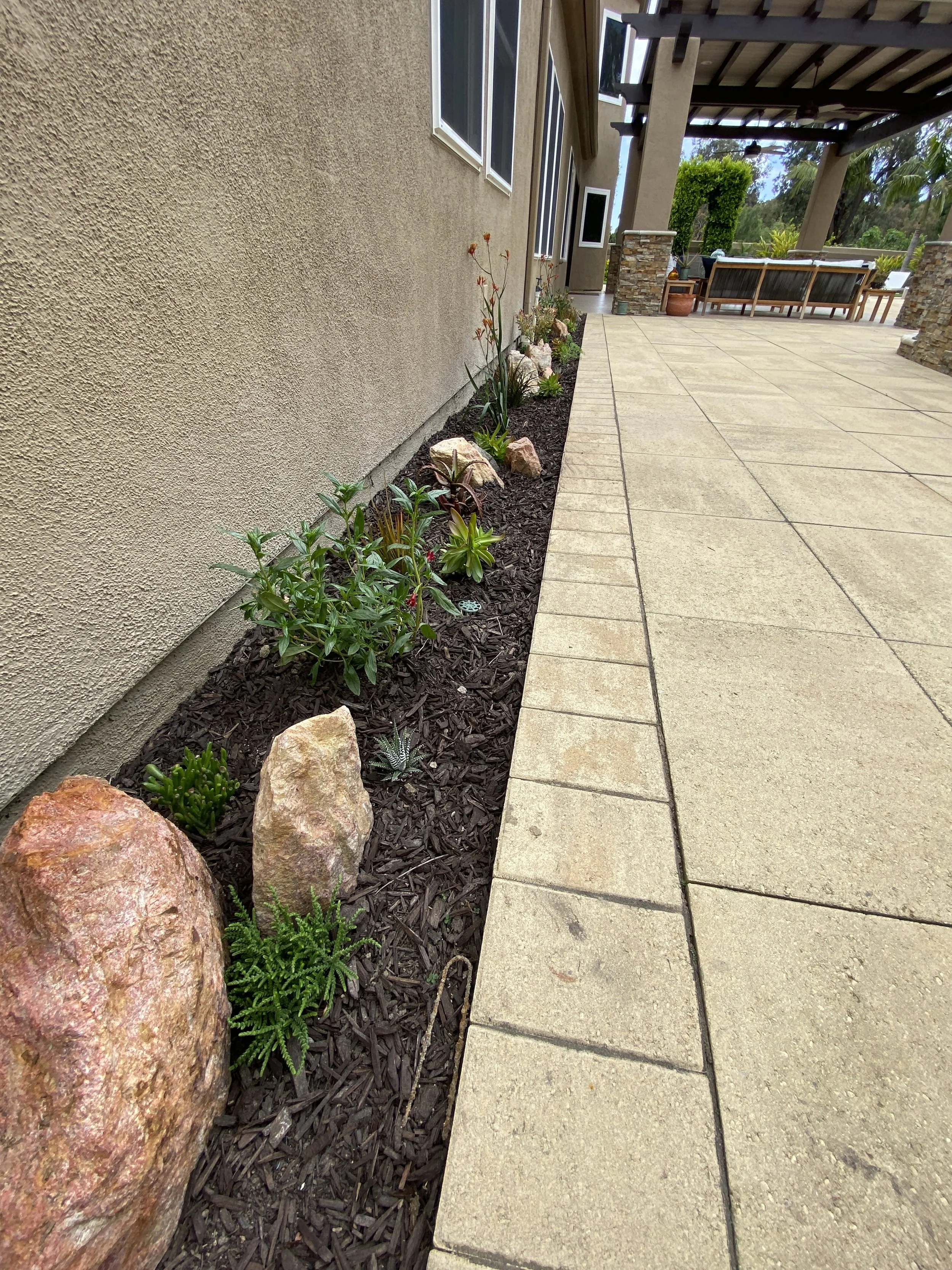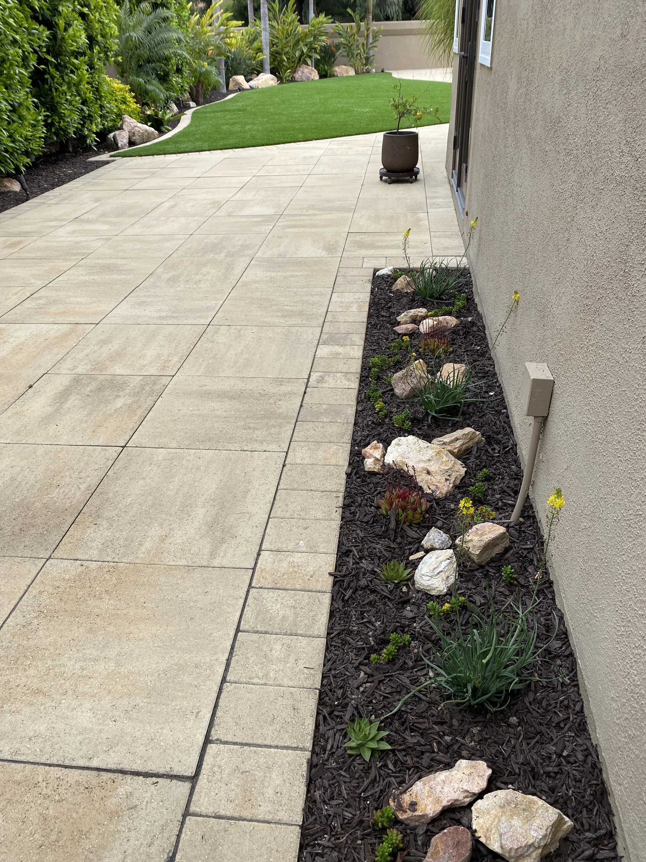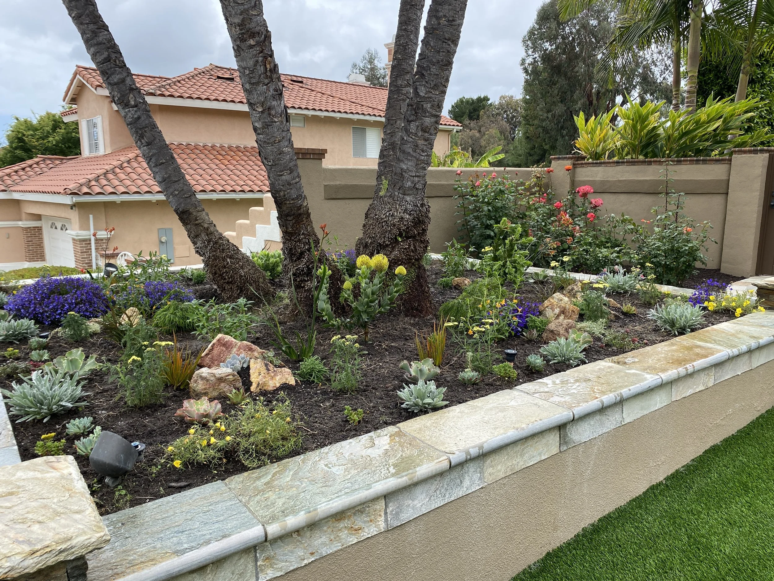 With a color pallette of yellows, reds, and oranges a large palm planter and two tiny planting strips in the back are now little vignettes of colors and textures that take you on a journey. These spaces were previously used for rotating flowers, now they will save a lot of water and have a full lush garden that’s easy to care for.