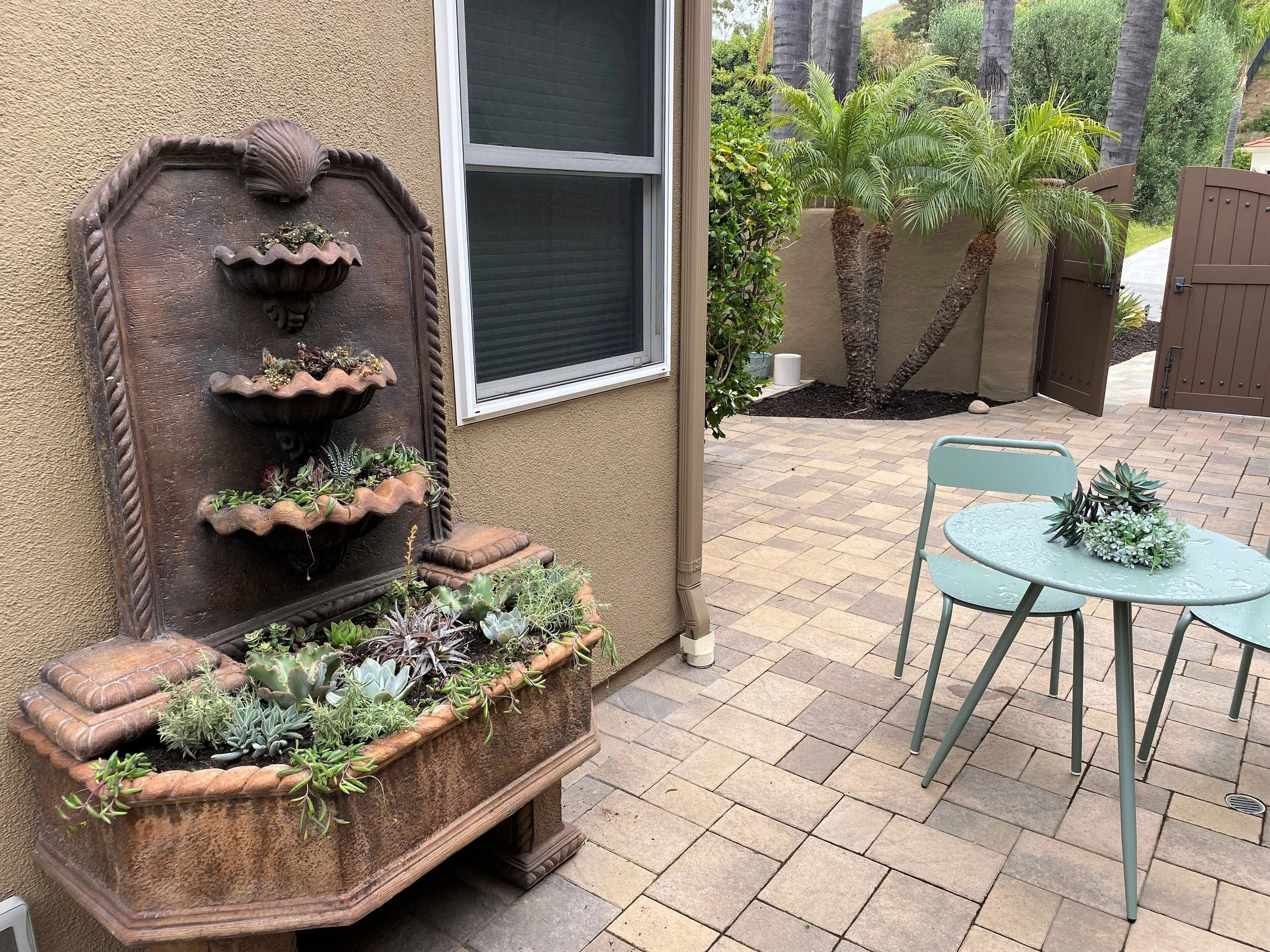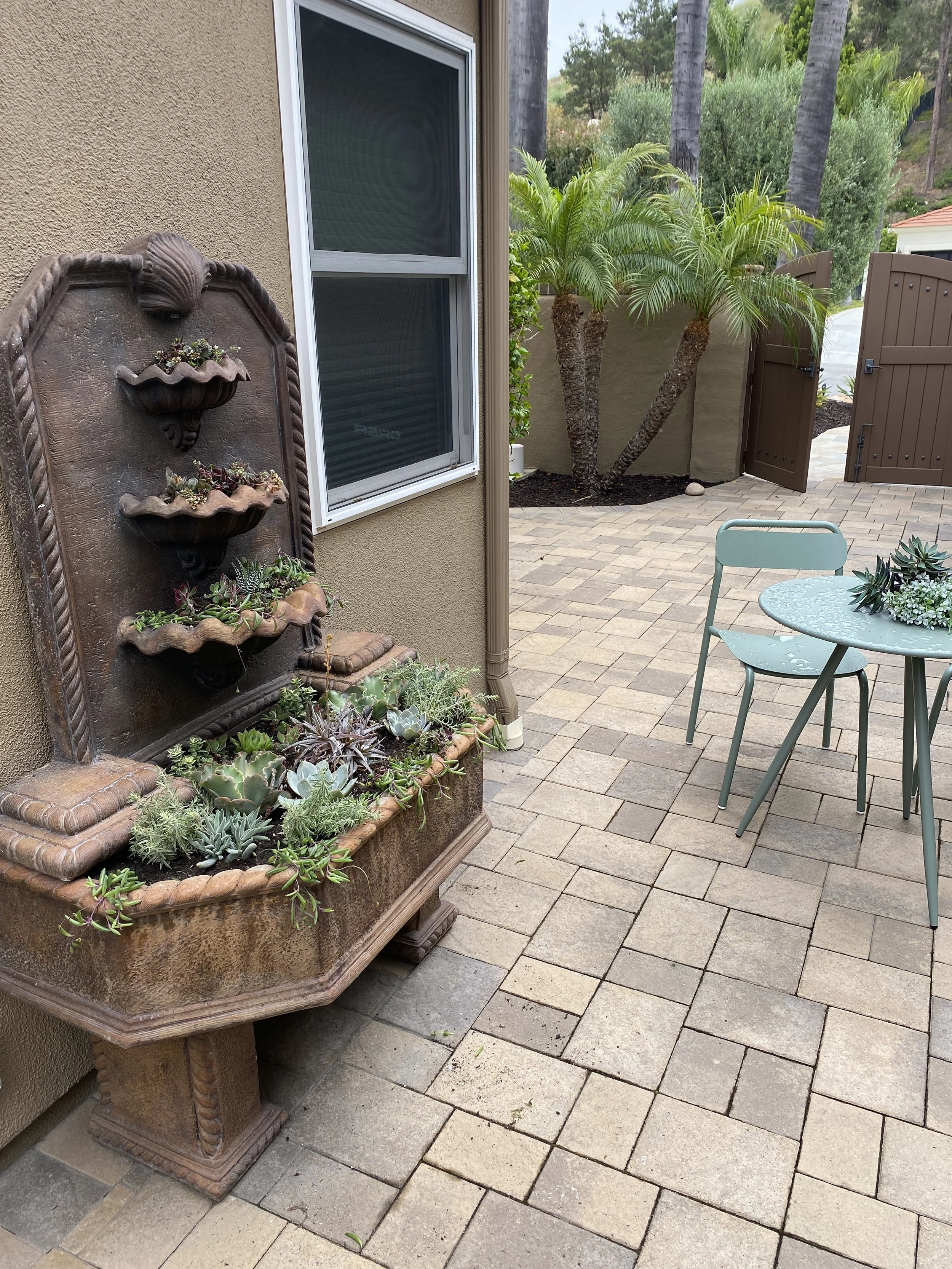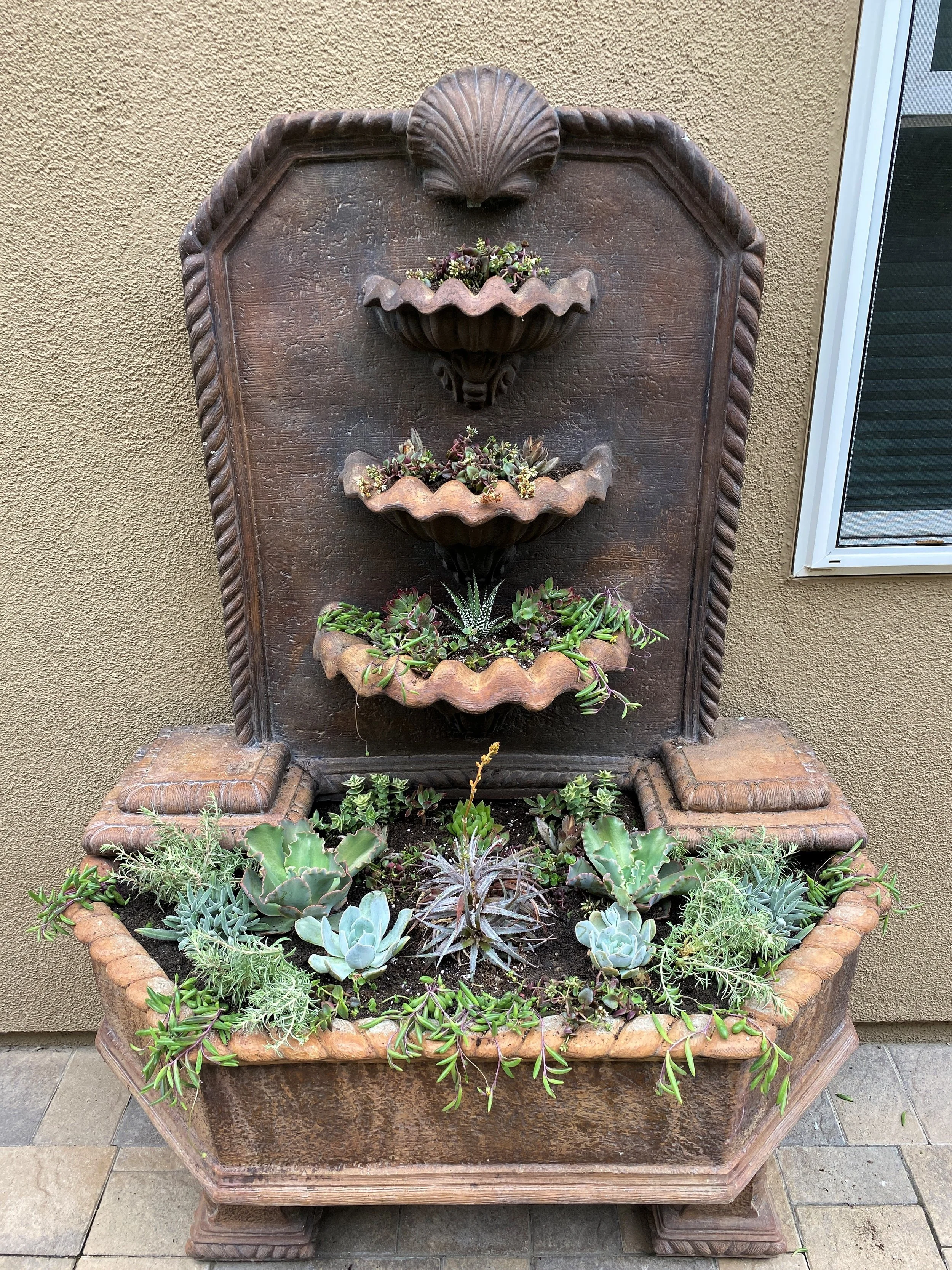 With plant names like Monkey flower, Cousin Itt, Jester, and Kangaroo paw you know it’s going to be a fun garden! Arranging the little rock gardens and ‘river’ of Pork & Beans succulents made this such a fun project. I Love repurposing fountains as planters too, all the trailing succulents are going to look like green flowing water.